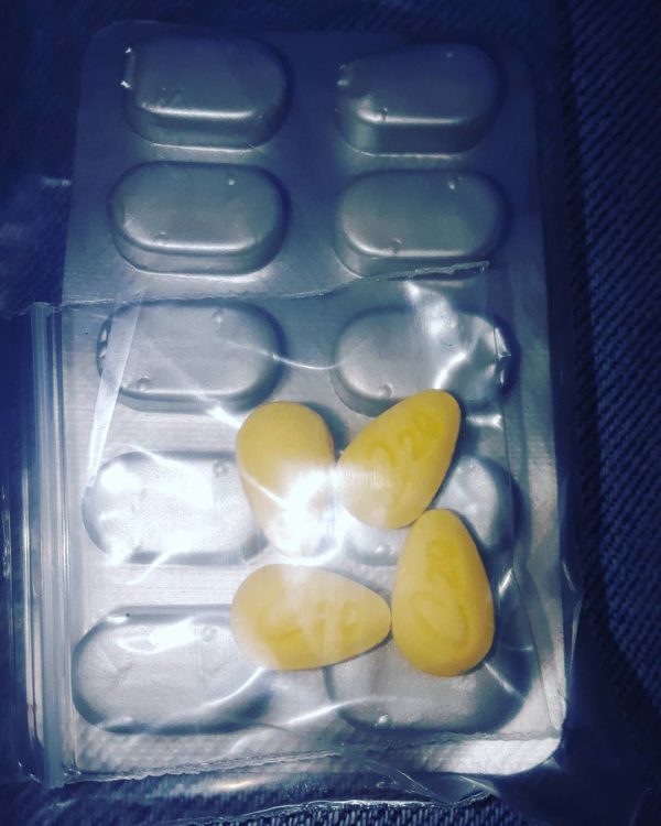 Shape/Color: Elliptical / Oval Yellow Tablets